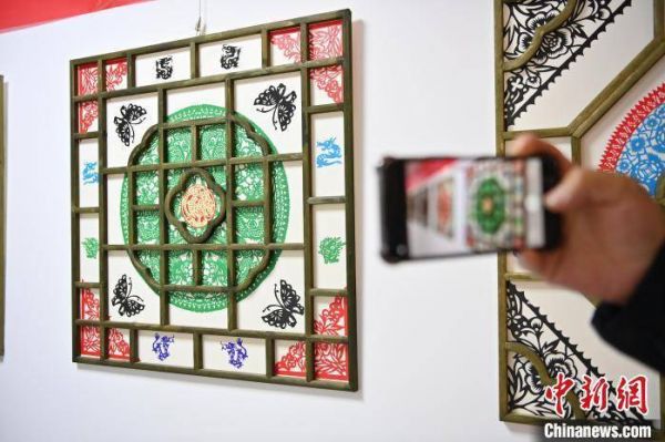 窗花是中国古老的传统民间艺术,已有上千年的历史。图为游客拍摄传统窗花展。 高莹 摄
