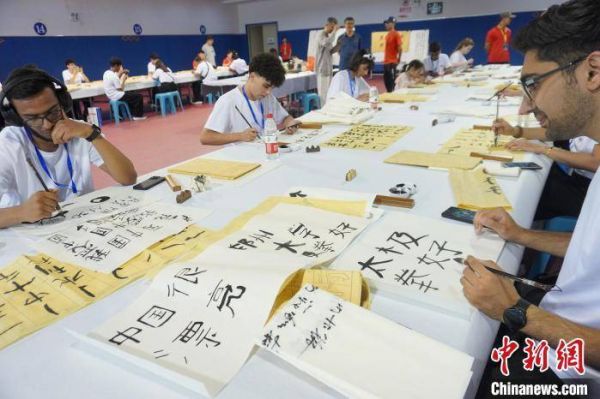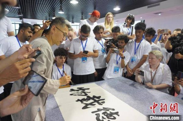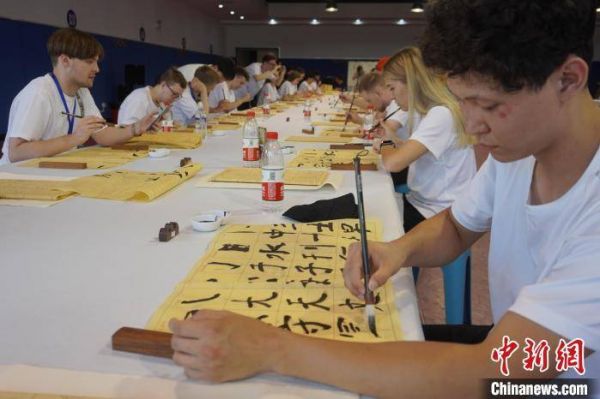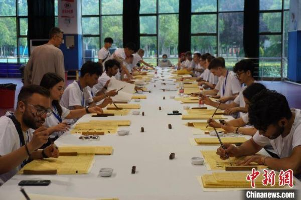 7月8日,2023年“Z世代”中国功夫(太极拳)国际化推广“请进来”活动训练营成员在河南焦作体验中国书法艺术。这些训练营成员既有从俄罗斯远道而来的大学生,也有来自郑州大学、河南理工大学、华南师范大学等高校的留学生。在当日的体验活动中,洋学生们了解中国书法发展历史、学习握笔技巧并尝试创作书法作品,体验中国书法艺术。