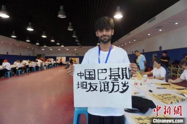 图为巴基斯坦留学生展示创作的书法作品。 韩章云 摄