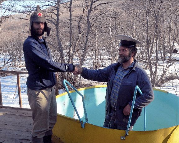 安德烈·卡特科夫和斯拉特庆祝2009年鱼鸮野外季节的结束。图片提供:乔纳森·斯拉特。