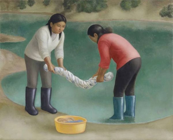 在2022年的创作《洗衣2》中,湖边穿着雨鞋的两名少女协力拧着浣洗的衣物,面部朝向观众的一位眼神朝向拧紧的衣服,却最终没有停落在衣物上,嘴角浮出一丝浅浅的笑容——显然,她的思绪已游曳到了令她激动的远方。斑驳的绿色湖面、体积感突出的灌木,以及前景浸泡衣物的圆形水盆,均呼应了人物出神的状态。如此,现实和现实之外的灵性世界,嵌套在一处,形成不可分割的整体,急速扩大了画面的容载幅度。这种嵌套的结构贯穿展览的每幅作品。