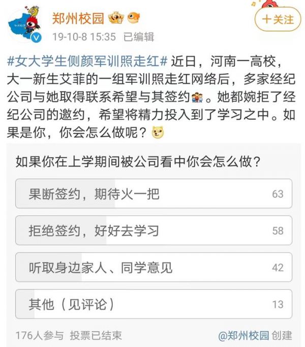 女孩的决定有人支持也有人不解,还有人发起了一个投票,结果多数的人认为女孩应该果断签约,趁机火一把。