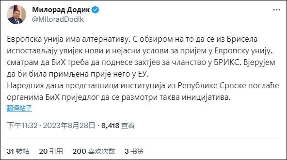 多迪克在X平台(原推特平台)发文写道,并补充说,波黑塞族共和国将在未来几天提出申请加入金砖国家组织的的正式提案,以考虑这一举措。