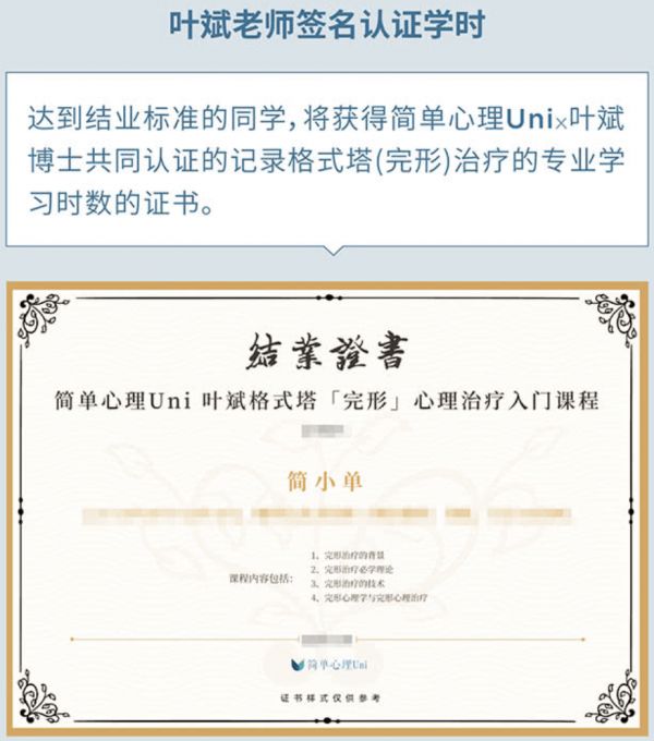 顺利毕业后你获得叶斌博士 x 简单心理Uni认证的结业证书,导师 + 品牌的双重认证,你每一天的努力都将被记住!