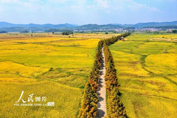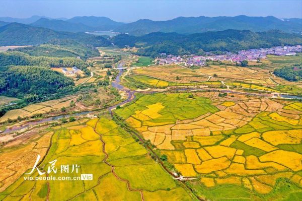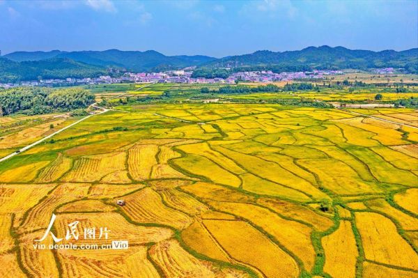 2023年8月30日,江西省抚州市金溪县黄通乡曾家村千亩有机稻成熟,金黄的稻田与青山、民居、村道等相映成趣,构成一幅美丽的秋日山村田园画卷。邓兴东摄(人民图片网)