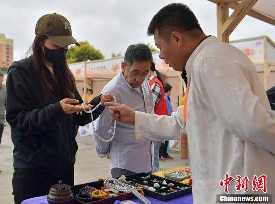 玉雕“非遗”传承人在向市民介绍制作技巧。刘栋 摄