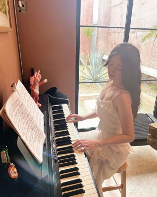 从朱晨丽分享到社交平台上的照片来看,朱晨丽那时就正喝着咖啡,在钢琴上弹琴,她的事业线还是很好的显露出来,非常有女人味。