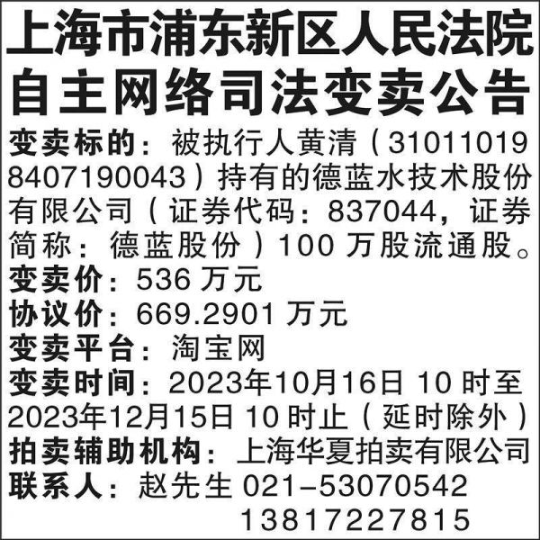 原标题:上海市浦东新区人民法院自主网络司法变卖公告