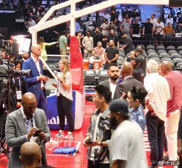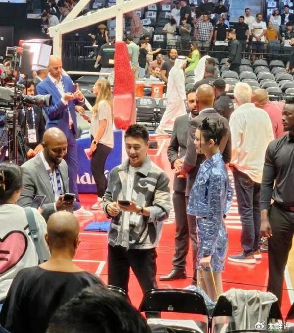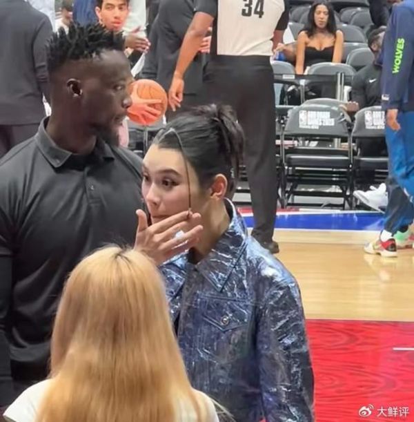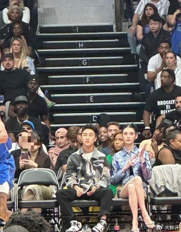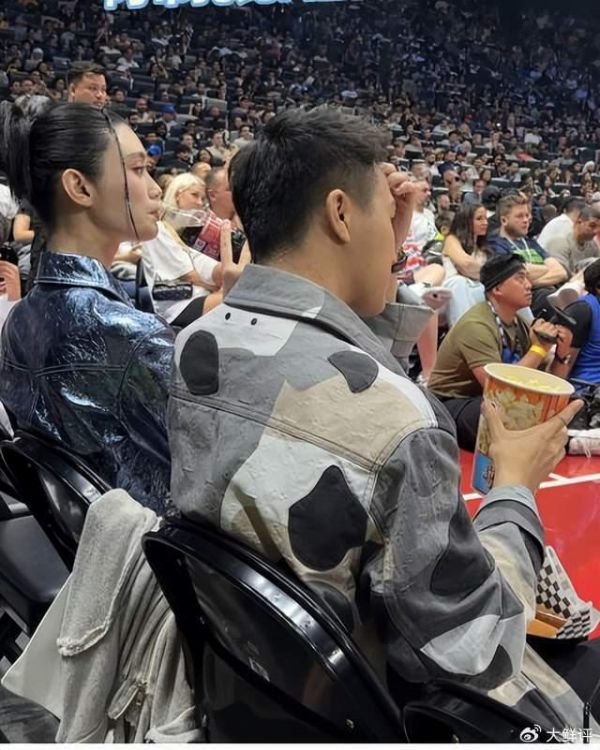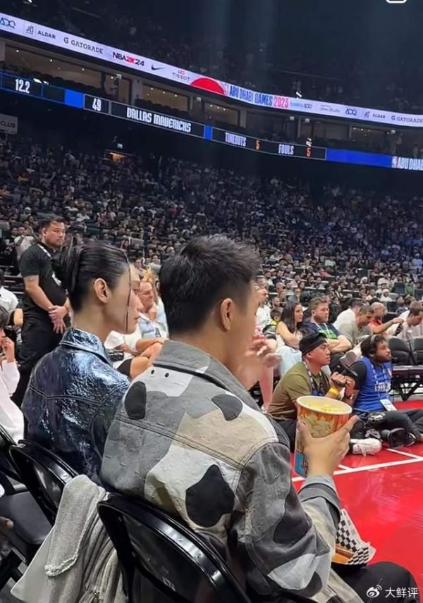 何猷君夫妇飞阿联酋,坐第一排看NBA,女方全程吃薯片悠哉看球
