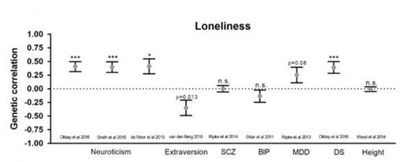 [3]Gao, J., Davis, L., Hart, A. et al. Genome-Wide Association Study of Loneliness Demonstrates a Role for Common Variation. Neuropsychopharmacol 42, 811–821 (2017).