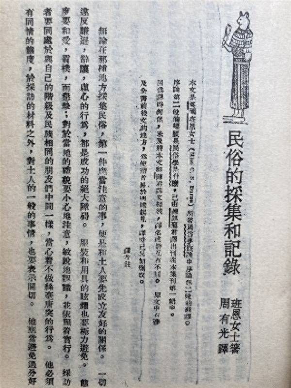 近翻阅民国民俗旧刊,发现著名语言学家周有光的一篇译文,有关于民俗调查的主题,原文作者为英国学者。其实早在1933年,周有光留学日本时就曾关注过语言学,并在当地学习日语,同时留心日本学者对于中国吴方言的研究,尤其是评弹语言的研究,因此后来他推动了《苏州评弹记言记词》一书在日本的传播。但使人们知道他的翻译成就则是1986年《简明不列颠百科全书》的翻译出版,周有光当时还是《简明不列颠百科全书》中美联合编审委员会和顾问委员会中方三委员之一,为此“周百科”的外号也算是“名至实归”。而这篇有关民俗的文章,则是英国著名女民俗学者班恩女士(C.S.Burne)的代表作,书名为《民俗学是什么》(又名《民俗学手册》),当时可以媲美人类学者马林诺夫斯基的相关著作。此文其他章节曾有福州协和大学教授陈锡襄(北京大学毕业,曾赴英国伦敦留学)翻译刊登,而周有光则是该著作“序论第二段的翻译”。