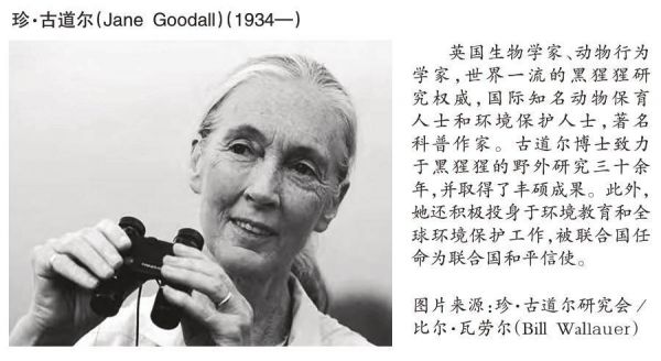 珍·古道尔毕生致力于黑猩猩的野外研究,并取得了丰硕成果。此外,她还积极投身于环境教育和全球环境保护工作,曾获得英国动物权益研究所授予的艾尔伯特·史威策奖、大不列颠百科全书授予的传播造福人类知识杰出工作者奖,被联合国任命为联合国和平信使,被英国皇室授予女爵士头衔。近些年来,她奔走于世界各地,呼吁人们保护野生动植物和地球环境。让“根与芽”成为地球的希望。