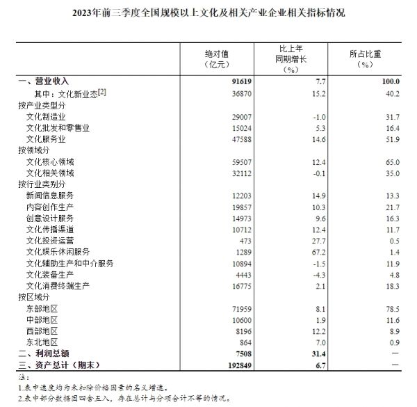 国家统计局:2023年前三季度全国规上文化及相关产业企业营业收入增长7.7%