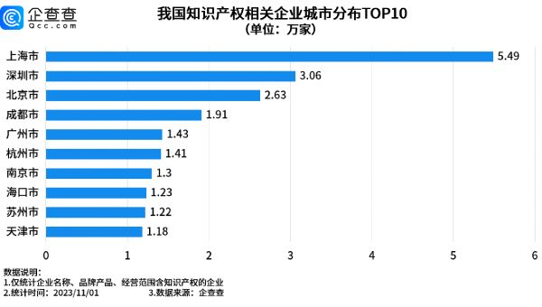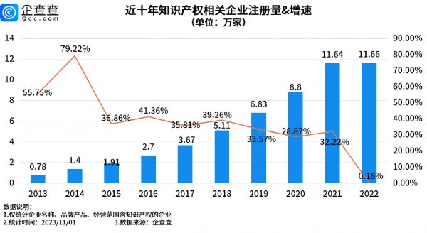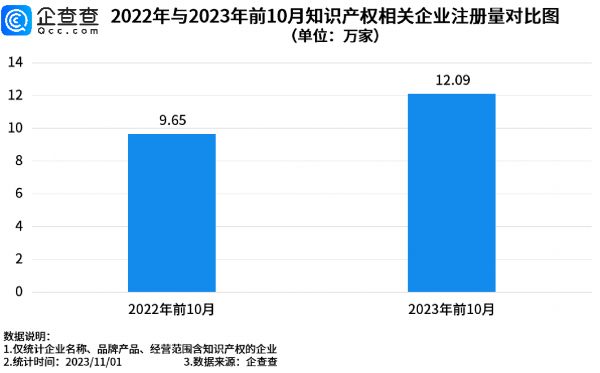 企查查数据显示,2022年及2023年前10月,我国知识产权相关企业新注册量分别为9.65万家、12.09万家,同比增长25.27%,已超去年全年水平。