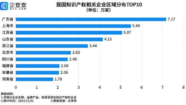广东省发布《广东省市场监管现代化“十四五”规划》,政策指出要加强重点安全领域监管、强化知识产权保护运用,推进知识产权强省建设,强化关键领域自主知识产权创造和储备,深化知识产权与产业发展融合,构建“严保护、大保护、快保护、同保护”格局。在政策利好的大环境下,据企查查显示,广东现存知识产权相关企业7.17万家,位居第一。