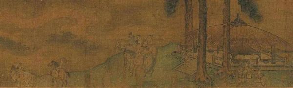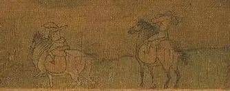 中间一组四人,全在马上,着宋朝文臣官服,正是出使金国的使者。马头前方有两个骑士,窄袖、束腰、紧腿。一人背负轴筒,为金国信差,马已进入奔跑状态;另一人立马回头,像是正跟宋使交谈。