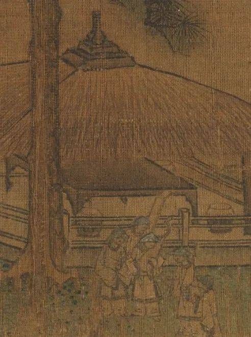 巨松之下的大草亭,立于一层厚实方整的基座之上,四面围栏,左侧留了一个下台阶的出口。茅草屋顶中央有个尖尖的建筑装饰,透露出一股宫廷气派。画家在亭边安排了三组人物,上演了一出迎来送往的戏剧。