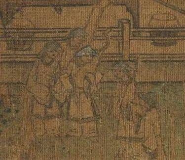 宋代绘画颜料材质的特性,紫色颜料通常容易剥落。因此可推断,最右一人有可能身着紫袍,身份最高。前面三人正与金国信差交谈,他却转身嘱咐立于亭阶之上的随从。