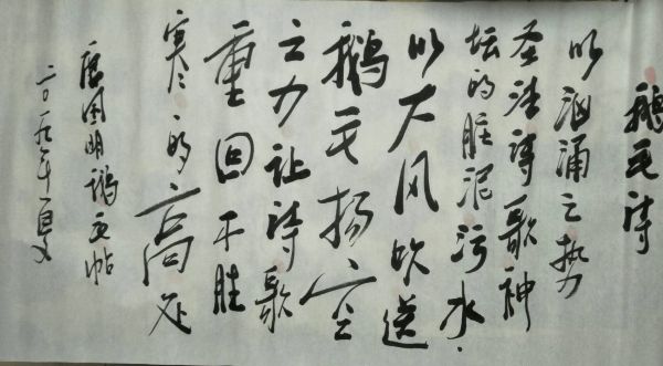 一个喊出力定乾坤、理安天下, “不失长风情怀,已具鹅毛风范”、“以汹涌之势圣洁诗歌神坛的脏泥污水,以大风吹送鹅毛扬空之力让诗歌重回不胜寒的高处”的鹅毛诗人