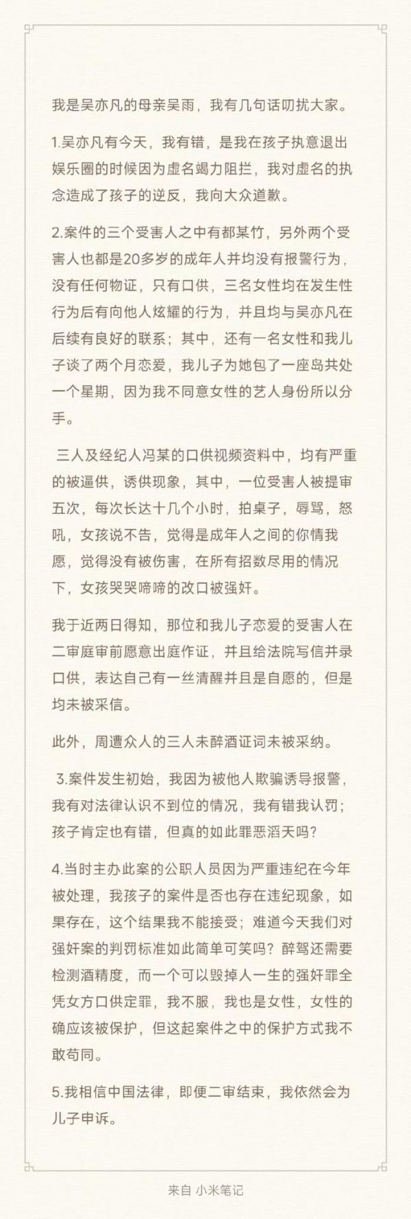 吴亦凡的妈妈在二审后发文,说孩子有错,责任在自己。但是她话锋一转,又为儿子喊冤。吴亦凡的妈妈还说相信法律,会继续申诉。不过很多网友觉得,既然二审法院都判了,应该是证据确凿,否则也不会是这样的结果。法律是公正的,如果没有新的决定性证据,还是应该相信判决。你们怎么看这件事?
