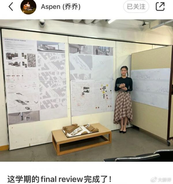 11月30日,刘秀盈在社交平台晒照,宣布自己完成了这个学期的学业。照片中的她扎着麻花辫,站在自己的作品前,身着黑色T恤搭配格子裙,一脸的骄傲。