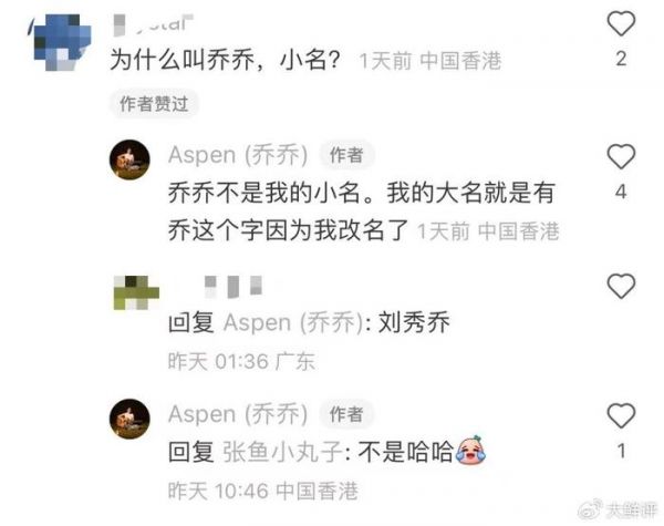 在评论区有网友询问她网名“乔乔”的意思,她表示自己已经改名了,表示“乔乔不是我的小名,我的大名就是有这个字”,而众所周知她的名字是刘銮雄取得,前面的“刘秀”是辈分,刘銮雄的两个女儿刘秀盈刘秀桦都是按照辈分取名。