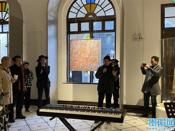 当天现场,贵州爵士乐队斑鸠乐队以音乐暖场,以律动唤醒感触,以音符碰撞色彩。据了解,一楼展厅的画作是策展人李新春精心设计的“混响空间”的主题,这些作品运动色彩点滴铺满了画幅,这些斑驳陆离被不同的色层叠加与遮盖与杂糅搭配起来,视觉直观下它们透漏出不同色层所表达出来的空间纵深,产生出的视觉直观与声音直观的混响,由此呈现为一种声音抽象。