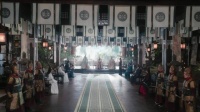 吴千语与施伯雄选择中式习俗结婚,女方穿着最传统的红色婚服。趁着红艳艳的“囍”字,果真是“人逢喜事精神爽”。