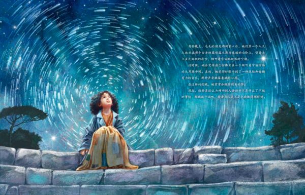那么,这位古茨施哈恩先生是怎么做的呢?他实际上舍弃了小说中的无数细节描写,小说后面有关时间窃贼灰先生的故事在此也只字不提,而是选择了重点描述毛毛的一种神奇能力——全神贯注地倾听。正是这样一种看似平平常常的能力,让小女孩毛毛成为了某种神一般的存在,乃至最后不可思议地打败灰先生、拯救了大家!因此,图画书故事收尾于毛毛独自坐在古老的圆形露天剧场的废墟中倾听着宇宙万物。