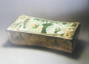 金陵出土的明器中有一只宋代萧何追韩信三彩枕,前低后高呈斜坡面,中间略凹。枕面主题纹饰为西汉萧何追韩信的故事,以山石、垂柳、云朵、牡丹作陪衬,四壁上部饰以叶形花纹。装饰题材新颖,施以黄、绿、白三色釉,色调鲜艳美观;胎色灰白细腻,制作工艺精细,是北京地区出土为数不多的宋代文物之一。金陵出土的另一件石枕,颜值则没那么高了,它为青石质,枕面凹,长21厘米、宽12厘米、高10厘米。
