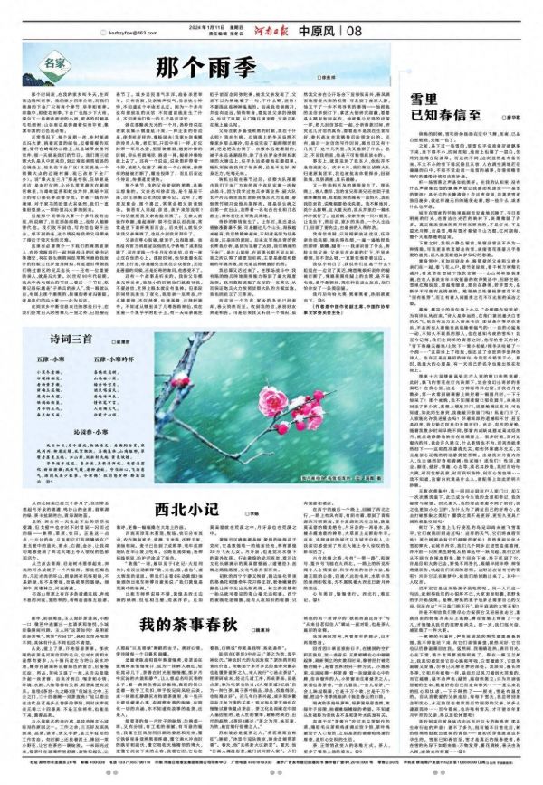 置身雪中,直如回到故乡,跟敬爱的父亲和父老乡亲们在一起,看飞花入户,看竹变琼枝,看千树万树梨花盛开,看麦苗在雪被下饱饮安寐……山山岭岭银装素裹,在农人喜谈来年丰收惬意的欢声笑语中,四野空明,雪里红梅绽放,那温情暖意,那自在静美,若非雪天,是断乎不可能有此情景的。难怪纳兰性德极赞雪花不仅“别有根芽”,而且有着人间富贵之花不可比拟的高洁之姿。