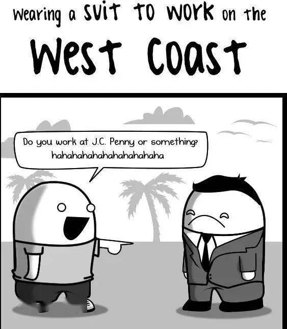 这里比较强势的产业是新兴高科技产业,大家脑补一下身边的程序员平常怎么穿,就知道西海岸的打工人上班穿啥了,在这里舒服最重要。