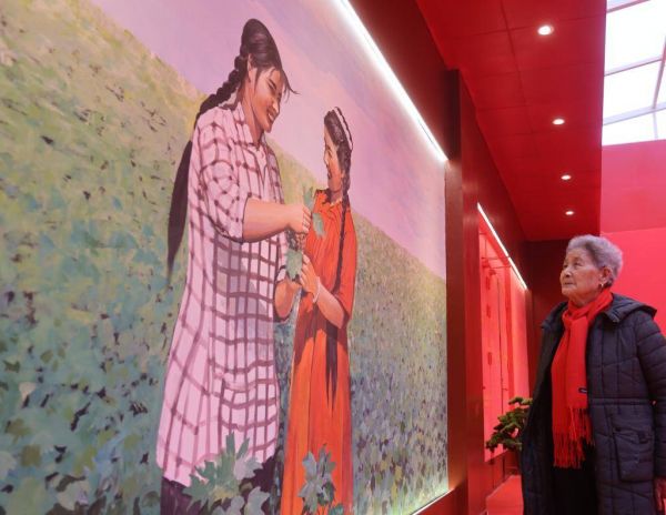 在第二师三十四团,高学兰正观看展示墙。(李嘉成摄)