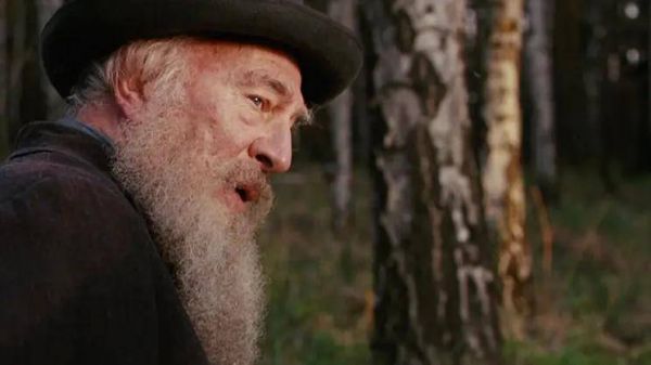 他很快地径直朝我走来,与此同时我还发现,他的步态和整个坐下来的姿势,都有点儿像我的父亲。他快捷地(膝部稍稍打弯)走到我的跟前,伸出手来,更确切地说是手掌向上地挥出一只大手来,抓住我的整个手,轻轻地握一握,并出乎意料地微微一笑,一种令人神往的、亲切的,同时又有某种悲伤甚至接近怜悯的微笑。我看见,那双天蓝色带灰色的眼睛一点儿也不可怕,而且不尖锐,只是像野兽般灵动,所剩无几的柔顺稀疏的灰色头发(头发的末梢有点卷曲),像农民那样梳成笔直的分头,一对很大的耳朵挂得非常高,眉毛的弧形凸起,胡子干燥、单薄、杂乱、透亮,可以看见稍稍突出的下颚……