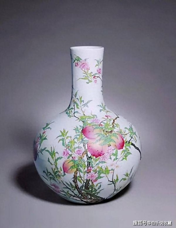雍正时期的粉彩瓷纹饰更加疏朗和规整,常见的有团花,团蝶,还有八桃蝙蝠等等,雍正时期一般会绘制8个桃子,而乾隆时期则绘制9个,所以也有“雍八乾九”的说法。