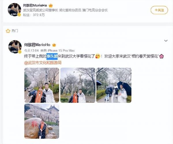3月25日赌王的儿子何猷君在自己的社交平台更新了动态,原来他带着妈妈去了武汉大学看樱花去了,要知道现在武汉大学正是樱花开放的季节,这个时候的樱花是非常漂亮非常美的,每年的这个时候武汉大学都会吸引全国的小伙伴们过来,没想到的是何猷君这么孝顺,还带着老妈梁安琪过来了。