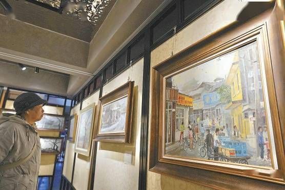 “京城京韵张春明——老北京人眼里的北京”油画展昨天在角楼图书馆开幕,展出60余幅生动诠释老北京文化的油画作品。 本报记者 程功摄