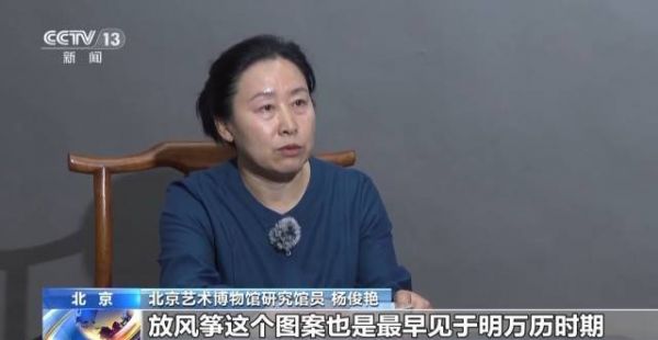 北京艺术博物馆研究馆员 杨俊艳:放风筝这个图案也是最早见于明万历时期,在古代这种儿童放风筝的图案,叫春风得意纹。线是随着风在飘动,升入高空能够一路升高的这种吉祥寓意。