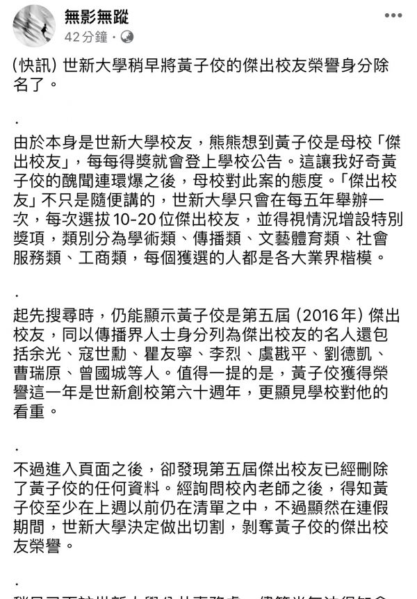 4月8日,有网友发现黄子佼已被世新大学移除杰出校友名单。据悉,黄子佼曾获世新大学第五届杰出校友奖项。