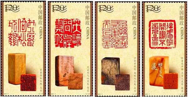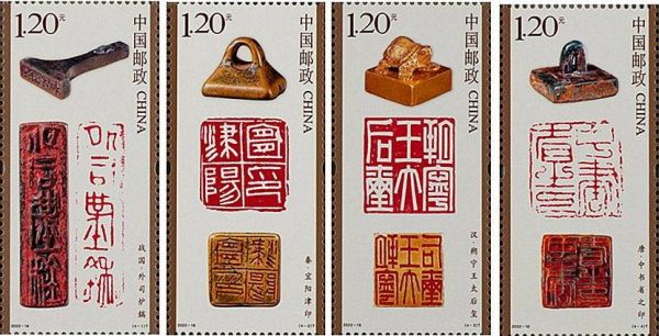 2022年8月5日,中国邮政发行了《中国篆刻》特种邮票一套4枚,展现战国、秦、汉、唐代的四枚篆刻作品,形制丰富、材质多样,反映了我国篆刻艺术从战国到唐代的发展变迁。邮票第一图是“战国·外司炉鍴”,铜印,通高9.5厘米,为战国时期燕国官印,有观点认为其为掌管铸造钱币的职官之官印,现藏于北京故宫博物院;第二图是“秦·宜阳津印”,铜印,印面纵横各2.3厘米,是秦代管理宜阳县渡口官员的官印,现藏于上海博物馆;第三图展现的“汉·朔宁王太后玺”,金印,边长2.4厘米,高2厘米,为西汉末年反对王莽的义军首领之一朔宁王为其母亲镌刻,现藏于重庆中国三峡博物馆;第四图展现的“唐·中书省之印”,铜印,印面5.7厘米×5.6厘米,通高3.9厘米,为唐代中央官署官印,现藏于北京故宫博物院。