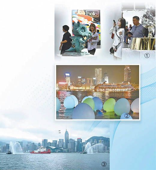 图①:观众参观2024年巴塞尔艺术展香港展会。 李志华摄(影像中国) 图②:香港维港“发光蛋”艺术装置与航行在维港上的邮轮。 李志华摄(影像中国) 图③:近日,执行中国第四十次南极考察任务的“雪龙2”号在香港举行公众开放日活动。图为“雪龙2”号通过维港时受到海事传统喷水欢迎。 侯 宇摄(影像中国)