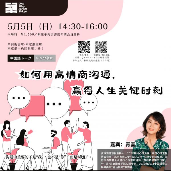 5 月 5 日(周日)14:30-16:00,单向街书店·东京银座店约你来聆听知名心理治疗师、前央广金牌主持人青音的温情分享,学会使用巧妙的沟通,打破东亚文化对人的束缚,让沟通成为赢得人生的关键时刻。