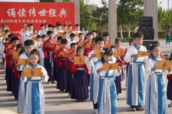 4月27日下午5时,在老子故里鹿邑县弘道苑广场,100余名青少年儿童身着古装,手捧竹简,声情并茂地集体诵读《道德经》中的部分章节内容。