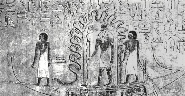 埃及太阳神拉经历他的夜晚新生之旅,他的太阳船行驶在阿菲波斯的腹中。这幅石灰岩壁画发现于塞提王一世的陵墓中,大约创作于公元前1200年的新王国时期。图片来自《任性的大脑》一书。