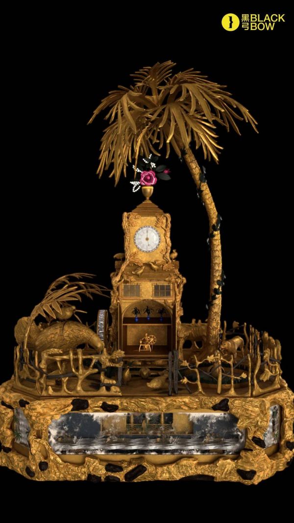 为了让参观者能够更深入地了解这些钟表藏品中蕴藏的历史文化内涵与精美的内部机械原理,黑弓BLACKBOW在“铜镀金乡村音乐水法钟”的数字艺术体验装置的呈现上以高精度还原文物外观及内部组件,设置装置内外多个视角,形成独特的数字文物观览体验,让游客得以通过沉浸式、由表及里的方式深入感受水法钟文物的精巧设计。东西方文化艺术与钟表机械有了浪漫的碰撞。