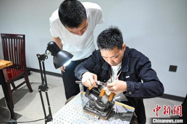 林陵祥(左)指导制作银器。黄子煖 摄