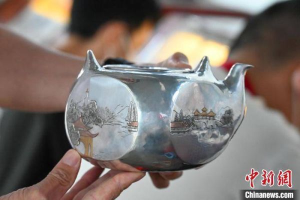 林陵祥逐渐掌握了锻制银壶的各种复杂技艺,其中最特别的当属“金银错”手艺。“金银错”源于商周时期,原是用在青铜器上,在林陵祥的钻研下,得以在白银茶壶上展露一二。2016年,凭借着“金银错”工艺,林陵祥获得第十届海峡两岸(厦门)文化产业博览交易会“海峡工艺精品奖”金奖,还得到了“‘金银错’银壶第一人”的名号。