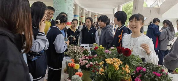 艺术原创作品展卖会上,“摊主”们拿出了自己的手工作品、个人收藏以及种植的绿植售卖。为了招揽生意,有的摊位大声吆喝、有的摊位扮起了人偶,吸引了不少学生前来挑选喜爱的物品,场面十分火爆。