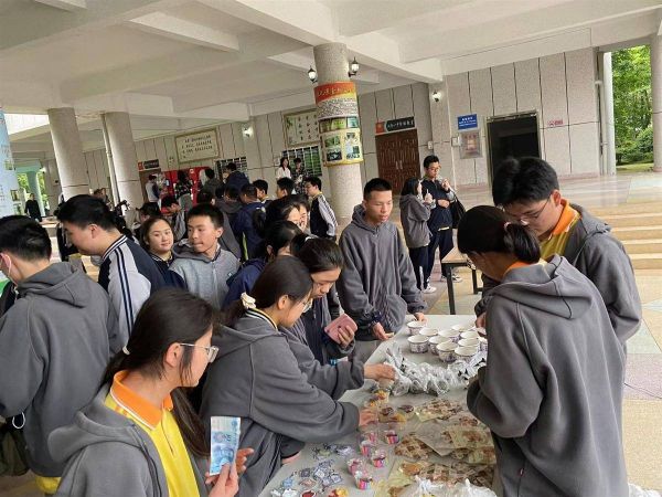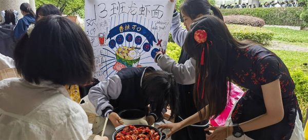 香辣可口、贼好吃、剥壳服务开放,高一(13)班的龙虾面档口,图文并茂地制作了海报,“摊主”卖力吆喝,吸引了海量同学光顾。美食区的摊位前,人头攒动,薯条、鸡翅、烤肠等同学们爱吃的食物一应俱全,“主厨”忙得满头大汗,“收银员”不停在账本上记录。