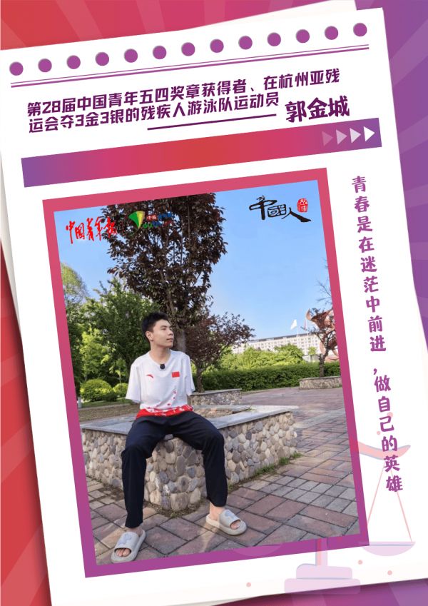 记者见到第28届中国青年五四奖章获得者、曾在杭州亚残运会夺3金3银的河北残疾人游泳队运动员郭金城时,他正在中国残疾人体育运动管理中心进行封闭训练。2023年,杭州亚残运会上,他的一段比赛视频曾在网上热传:高频摆腿自带“涡轮增压”般的加速,被称为“无臂飞鱼”的他,以50米几乎不换气的方式,打破了自己创造的亚残运会纪录,拿到冠军。